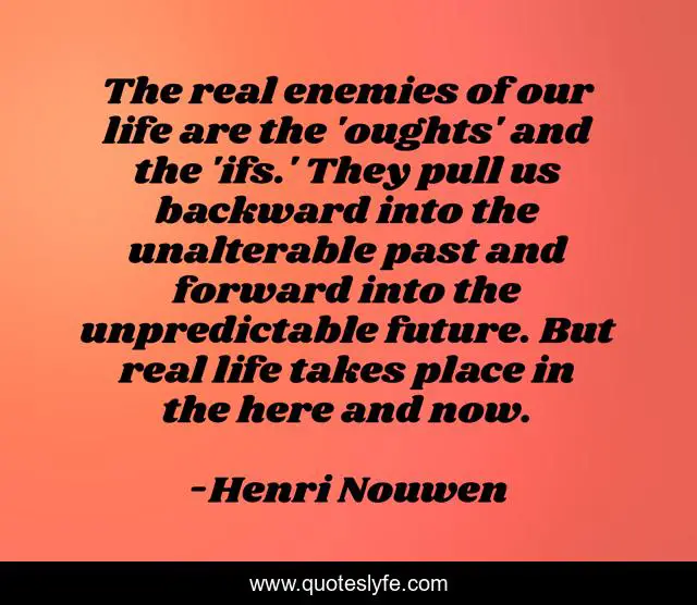 This page presents the quote "The real enemies of our life are the 'oughts' and the 'ifs.' They pull us backward into the unalterable past and forward into the unpredictable future. But real life takes place in the here and now.". Author of this quote is Henri Nouwen. This quote is about past, life, place,.