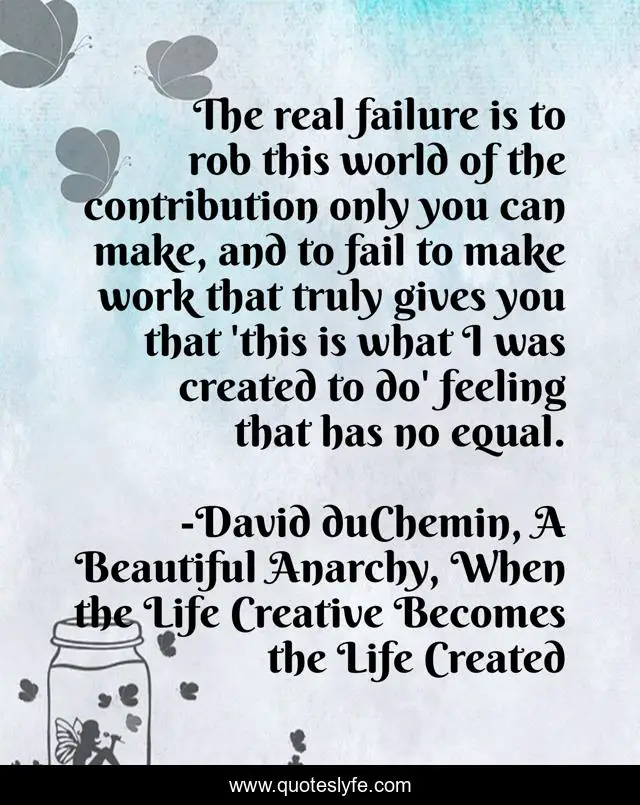 This page presents the quote "The real failure is to rob this world of the contribution only you can make, and to fail to make work that truly gives you that 'this is what I was created to do' feeling that has no equal.". Author of this quote is David duChemin, A Beautiful Anarchy, When the Life Creative Becomes the Life Created. This quote is about meaning-of-life, purpose, contribution-to-society,.