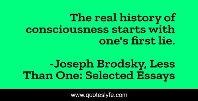 This page presents the quote "The real history of consciousness starts with one's first lie.". Author of this quote is Joseph Brodsky, Less Than One: Selected Essays. This quote is about consciousness, lying,.