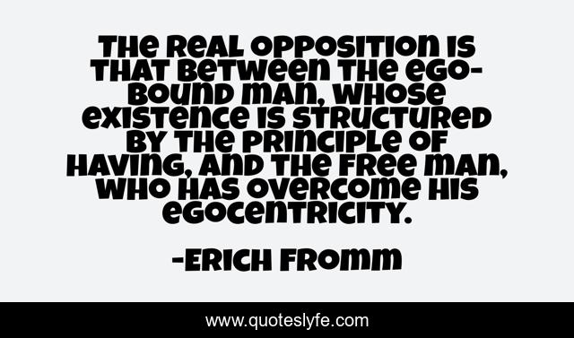 This page presents the quote "The real opposition is that between the ego-bound man, whose existence is structured by the principle of having, and the free man, who has overcome his egocentricity.". Author of this quote is Erich Fromm. This quote is about freedom, poverty, ego, materialism,.