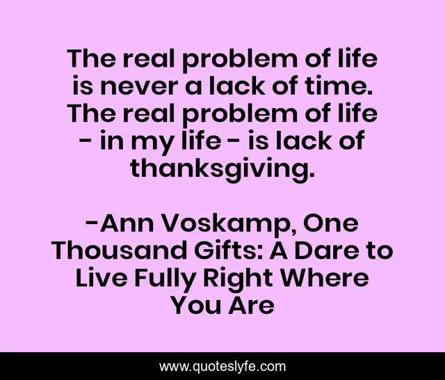This page presents the quote "The real problem of life is never a lack of time. The real problem of life - in my life - is lack of thanksgiving.". Author of this quote is Ann Voskamp, One Thousand Gifts: A Dare to Live Fully Right Where You Are. This quote is about 1, 000-gifts, christian-living, ann-voscamp, nonfiction,.