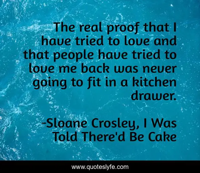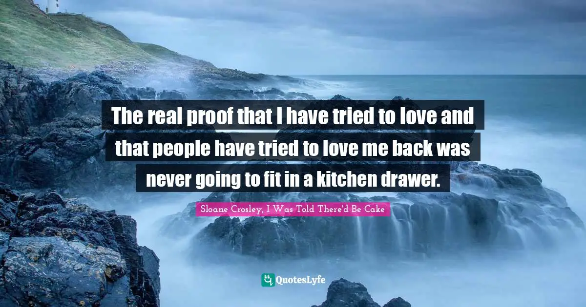 This page presents the quote "The real proof that I have tried to love and that people have tried to love me back was never going to fit in a kitchen drawer.". Author of this quote is Sloane Crosley, I Was Told There'd Be Cake. This quote is about book, books, sloane-crosley,.