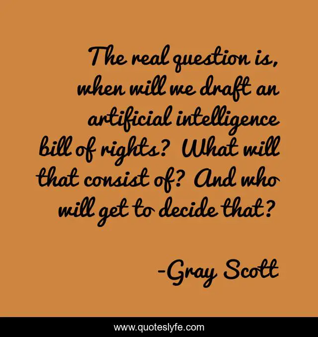 This page presents the quote "The real question is, when will we draft an artificial intelligence bill of rights? What will that consist of? And who will get to decide that?". Author of this quote is Gray Scott. This quote is about real, question, rights,.