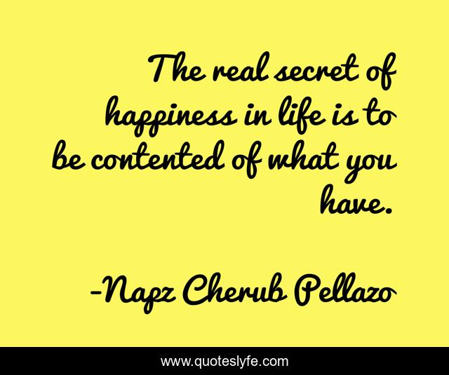 This page presents the quote "The real secret of happiness in life is to be contented of what you have.". Author of this quote is Napz Cherub Pellazo. This quote is about contented, happiness, secret-of-happiness,.
