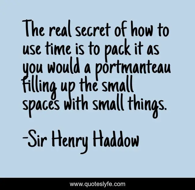 This page presents the quote "The real secret of how to use time is to pack it as you would a portmanteau filling up the small spaces with small things.". Author of this quote is Sir Henry Haddow. This quote is about day, one,.
