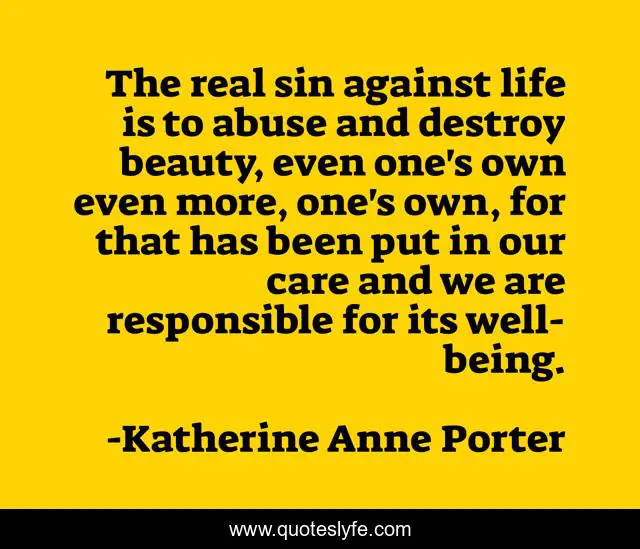 This page presents the quote "The real sin against life is to abuse and destroy beauty, even one's own even more, one's own, for that has been put in our care and we are responsible for its well-being.". Author of this quote is Katherine Anne Porter. This quote is about life, well-being, sin,.