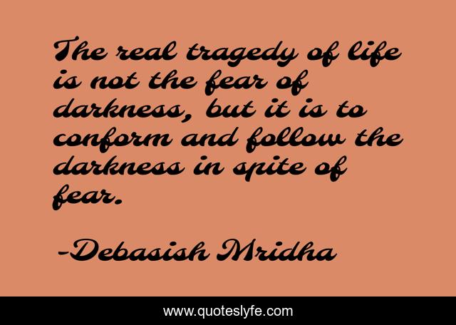 This page presents the quote "The real tragedy of life is not the fear of darkness, but it is to conform and follow the darkness in spite of fear.". Author of this quote is Debasish Mridha. This quote is about tragedy-of-life, fear-of-darkness, philosophy, debasish-mridha, quotes, debasish-mridha-md, inspirational, enthusiasm, what-is-the-tragedy-of-life,.