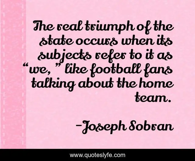 This page presents the quote "The real triumph of the state occurs when its subjects refer to it as “we, ” like football fans talking about the home team.". Author of this quote is Joseph Sobran. This quote is about state, statism, democracy,.