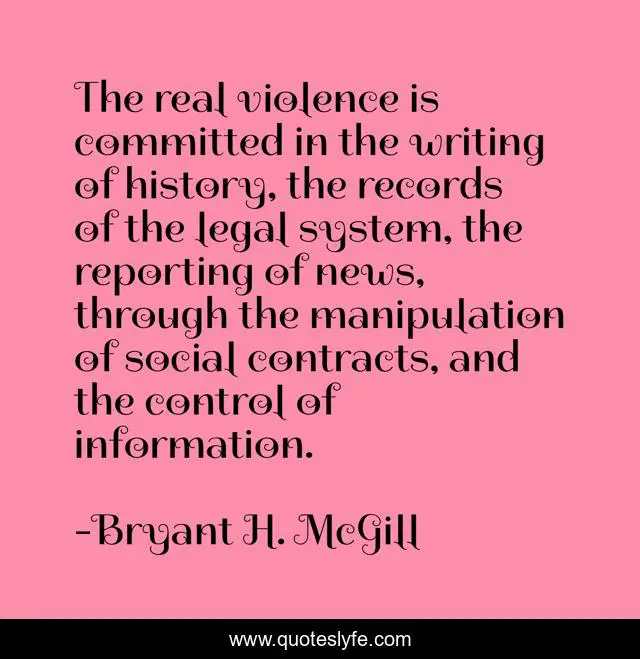 This page presents the quote "The real violence is committed in the writing of history, the records of the legal system, the reporting of news, through the manipulation of social contracts, and the control of information.". Author of this quote is Bryant H. McGill. This quote is about violence, history, writing,.