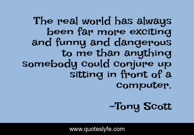 This page presents the quote "The real world has always been far more exciting and funny and dangerous to me than anything somebody could conjure up sitting in front of a computer.". Author of this quote is Tony Scott. This quote is about me, world, real,.