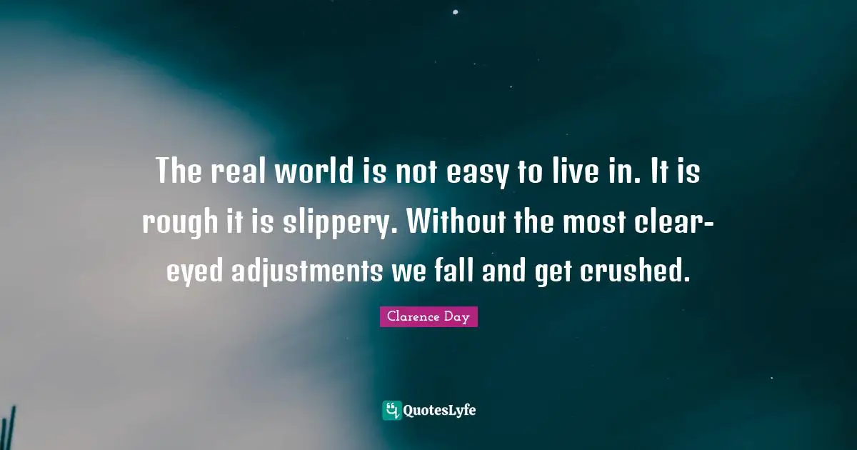 This page presents the quote "The real world is not easy to live in. It is rough it is slippery. Without the most clear-eyed adjustments we fall and get crushed.". Author of this quote is Clarence Day. .