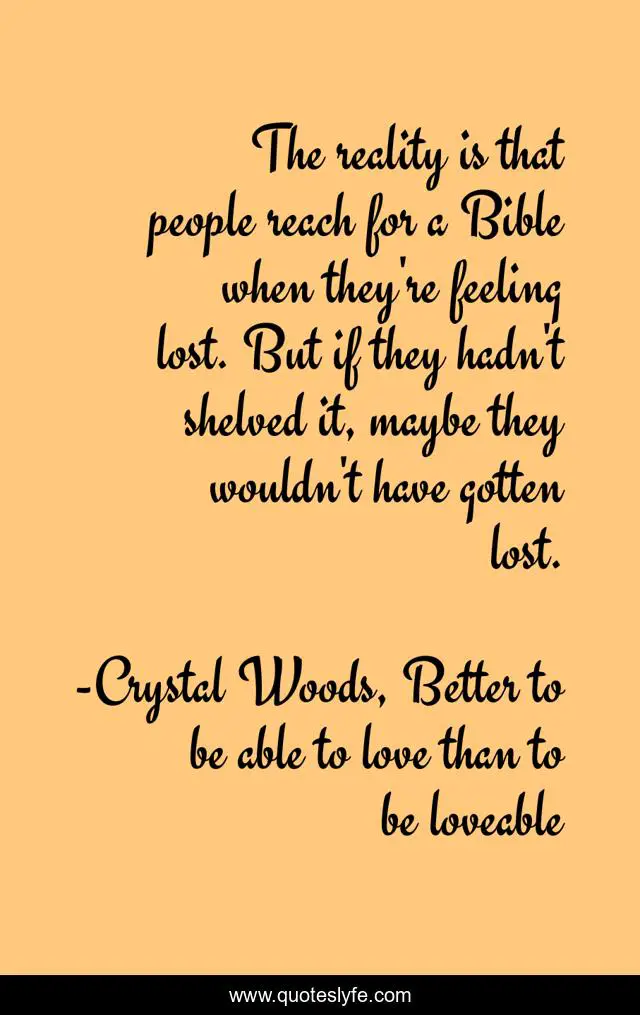 This page presents the quote "The reality is that people reach for a Bible when they're feeling lost. But if they hadn't shelved it, maybe they wouldn't have gotten lost.". Author of this quote is Crystal Woods, Better to be able to love than to be loveable. This quote is about life, bible, lost, guidance, reality, religion, books, wisdom,.