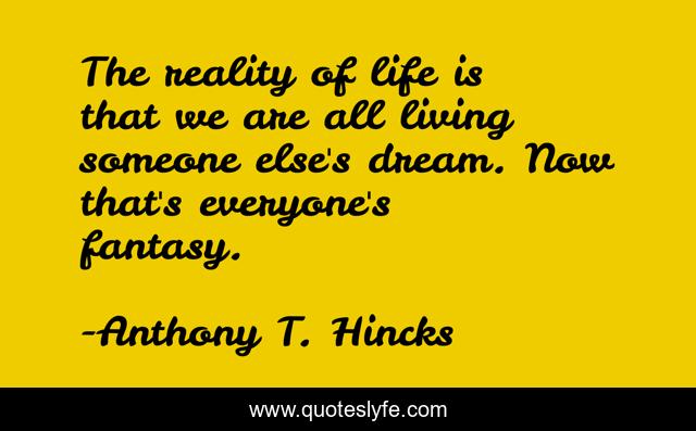 This page presents the quote "The reality of life is that we are all living someone else's dream. Now that's everyone's fantasy.". Author of this quote is Anthony T. Hincks. This quote is about living, someone, philosophy, reality, fantasy, elses, dream,.