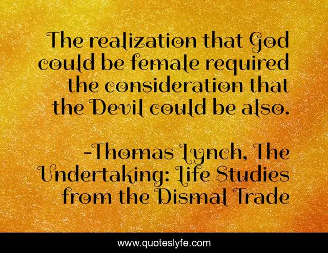 This page presents the quote "The realization that God could be female required the consideration that the Devil could be also.". Author of this quote is Thomas Lynch, The Undertaking: Life Studies from the Dismal Trade. This quote is about god, devil,.