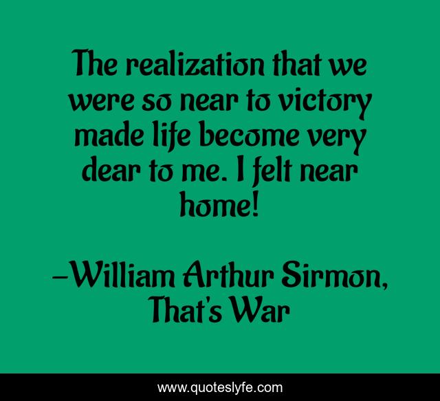 This page presents the quote "The realization that we were so near to victory made life become very dear to me. I felt near home!". Author of this quote is William Arthur Sirmon, That's War. This quote is about home, victory, war, inspirattional,.