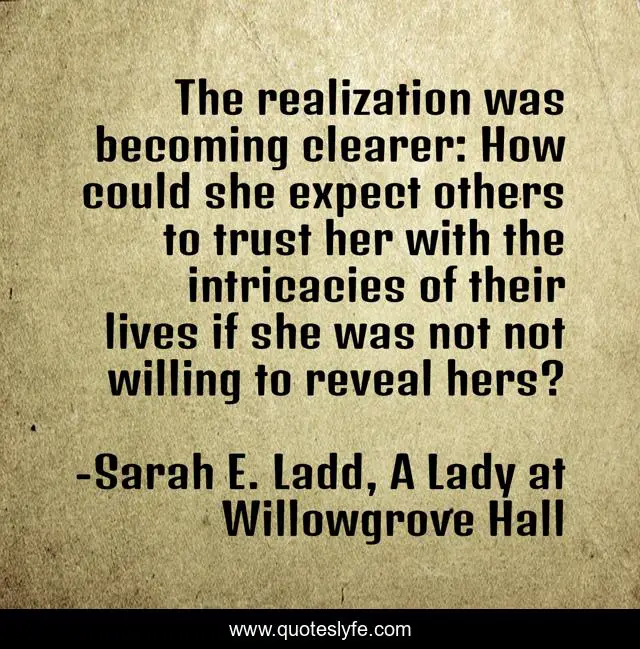 This page presents the quote "The realization was becoming clearer: How could she expect others to trust her with the intricacies of their lives if she was not not willing to reveal hers?". Author of this quote is Sarah E. Ladd, A Lady at Willowgrove Hall. .