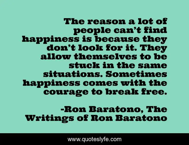 This page presents the quote "The reason a lot of people can’t find happiness is because they don’t look for it. They allow themselves to be stuck in the same situations. Sometimes happiness comes with the courage to break free.". Author of this quote is Ron Baratono, The Writings of Ron Baratono. This quote is about people, freedom, stuck, courage, situation, happiness,.