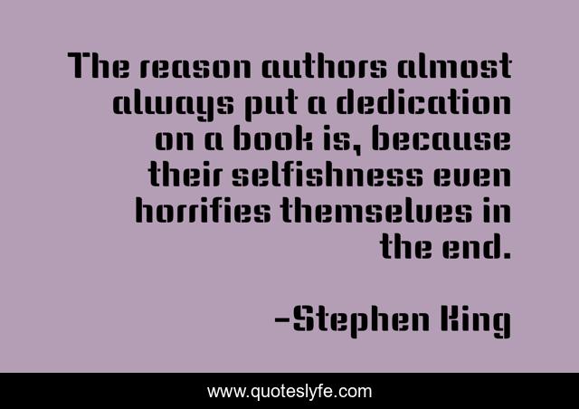 This page presents the quote "The reason authors almost always put a dedication on a book is, because their selfishness even horrifies themselves in the end.". Author of this quote is Stephen King. This quote is about truth, misery,.