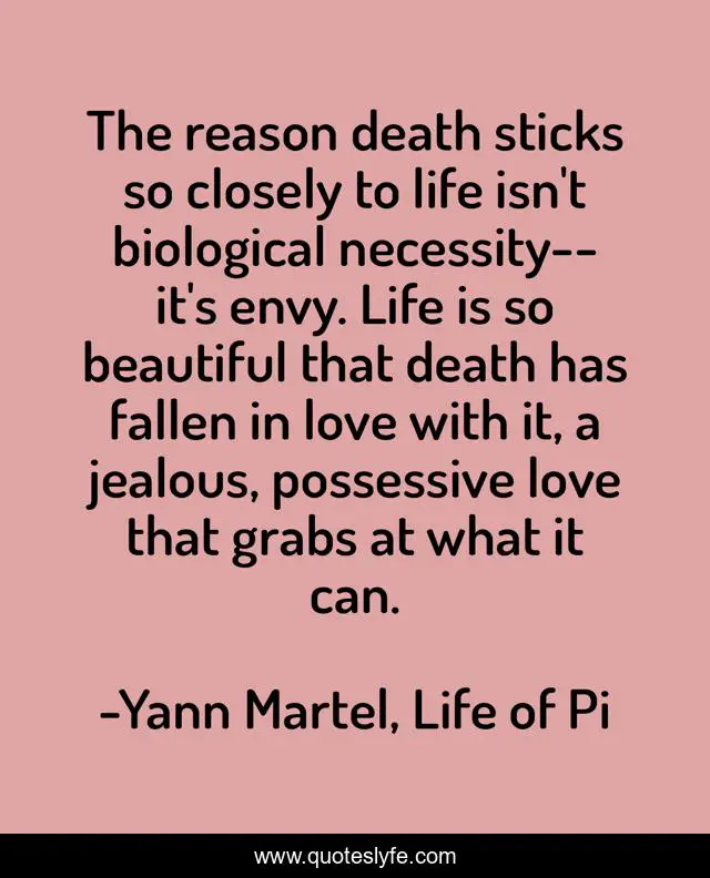 This page presents the quote "The reason death sticks so closely to life isn't biological necessity--it's envy. Life is so beautiful that death has fallen in love with it, a jealous, possessive love that grabs at what it can.". Author of this quote is Yann Martel, Life of Pi. This quote is about emotion, life, death, love, affection,.