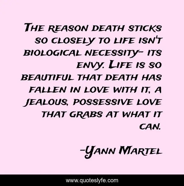 This page presents the quote "The reason death sticks so closely to life isn't biological necessity- its envy. Life is so beautiful that death has fallen in love with it, a jealous, possessive love that grabs at what it can.". Author of this quote is Yann Martel. This quote is about beautiful, science, inspirational, enthusiasm,.