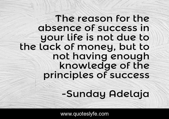 This page presents the quote "The reason for the absence of success in your life is not due to the lack of money, but to not having enough knowledge of the principles of success". Author of this quote is Sunday Adelaja. This quote is about prosperity, life, knowledge, success, money, lack, riches, principles, enough,.