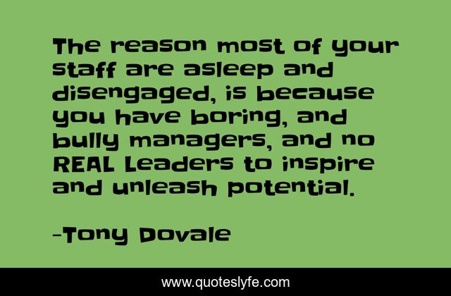 This page presents the quote "The reason most of your staff are asleep and disengaged, is because you have boring, and bully managers, and no REAL Leaders to inspire and unleash potential.". Author of this quote is Tony Dovale. This quote is about courageous-mindsets, swift-success, creativity, leadership, innovation, lifemasters, revolutionary-workplace, consciously-constructive,.