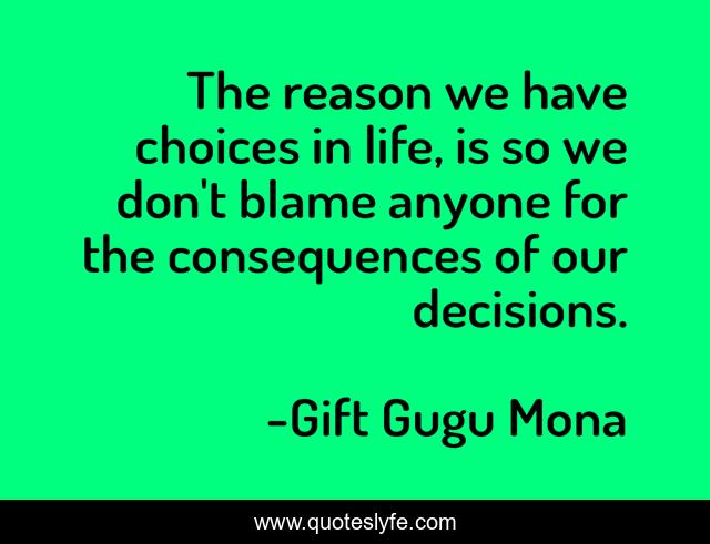 This page presents the quote "The reason we have choices in life, is so we don't blame anyone for the consequences of our decisions.". Author of this quote is Gift Gugu Mona. This quote is about anyone, blame, decisions, consequences, choices,.