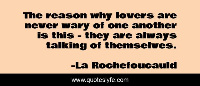 This page presents the quote "The reason why lovers are never wary of one another is this - they are always talking of themselves.". Author of this quote is La Rochefoucauld. .
