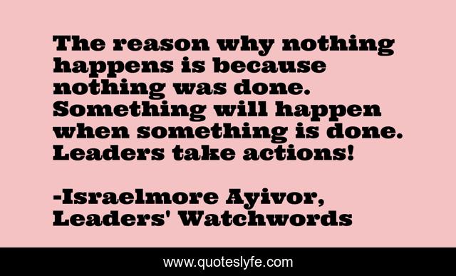 This page presents the quote "The reason why nothing happens is because nothing was done. Something will happen when something is done. Leaders take actions!". Author of this quote is Israelmore Ayivor, Leaders' Watchwords. This quote is about make-a-change, food-for-thought, innovate, do-something, leaders, lead, take-actions, act, invent,.