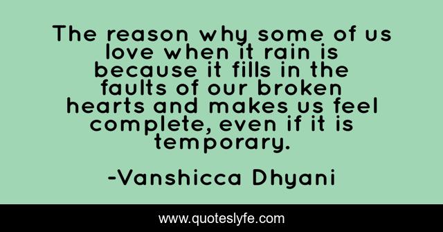 This page presents the quote "The reason why some of us love when it rain is because it fills in the faults of our broken hearts and makes us feel complete, even if it is temporary.". Author of this quote is Vanshicca Dhyani. This quote is about heart, love, love-and-sayings, feel, rain, faults, temporary, broken-hearts, vanshicca-dhyani,.