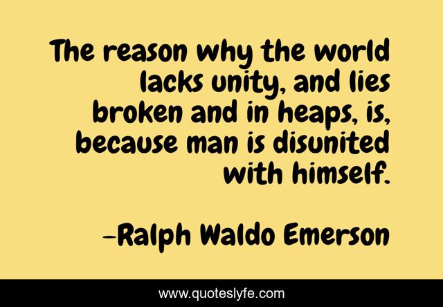 This page presents the quote "The reason why the world lacks unity, and lies broken and in heaps, is, because man is disunited with himself.". Author of this quote is Ralph Waldo Emerson. .