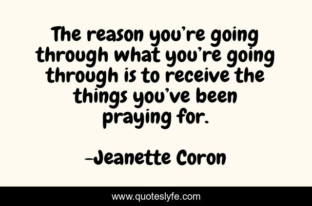 This page presents the quote "The reason you’re going through what you’re going through is to receive the things you’ve been praying for.". Author of this quote is Jeanette Coron. This quote is about power, prayers, going-through-difficult-times, pressure, no-heat-no-shine, no-pain-no-gain, pushing-through, overcoming-difficult-times,.