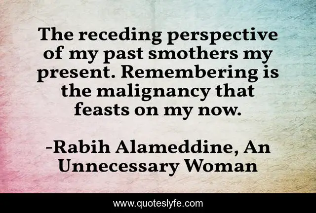 This page presents the quote "The receding perspective of my past smothers my present. Remembering is the malignancy that feasts on my now.". Author of this quote is Rabih Alameddine, An Unnecessary Woman. This quote is about past, memory,.