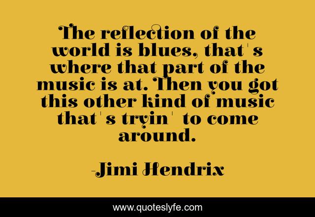 This page presents the quote "The reflection of the world is blues, that's where that part of the music is at. Then you got this other kind of music that's tryin' to come around.". Author of this quote is Jimi Hendrix. This quote is about world, blues, reflection,.