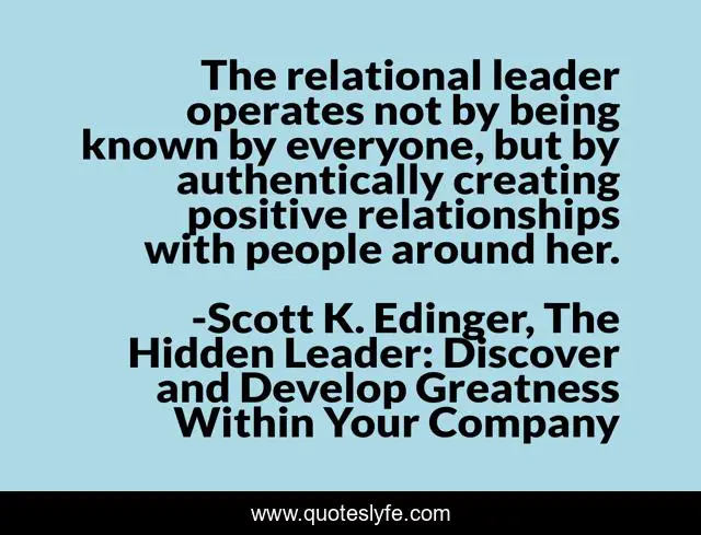 This page presents the quote "The relational leader operates not by being known by everyone, but by authentically creating positive relationships with people around her.". Author of this quote is Scott K. Edinger, The Hidden Leader: Discover and Develop Greatness Within Your Company. This quote is about relationships, leadership, leader, authenticity,.