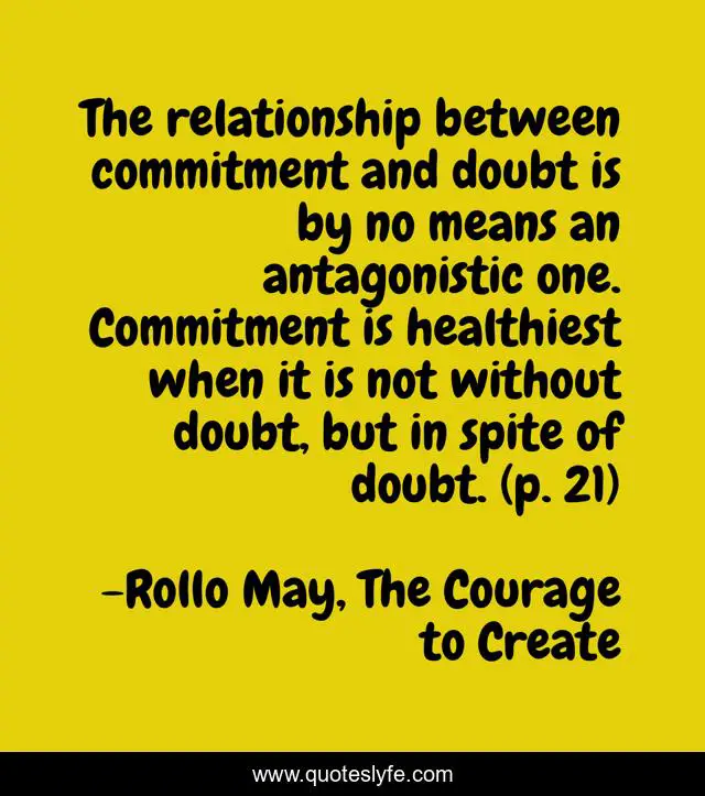 This page presents the quote "The relationship between commitment and doubt is by no means an antagonistic one. Commitment is healthiest when it is not without doubt, but in spite of doubt. (p. 21)". Author of this quote is Rollo May, The Courage to Create. This quote is about doubt, commitment, conviction,.