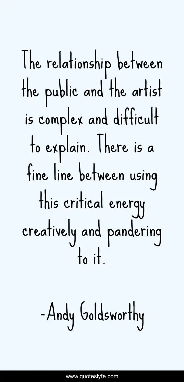 This page presents the quote "The relationship between the public and the artist is complex and difficult to explain. There is a fine line between using this critical energy creatively and pandering to it.". Author of this quote is Andy Goldsworthy. This quote is about energy, artist, difficult,.