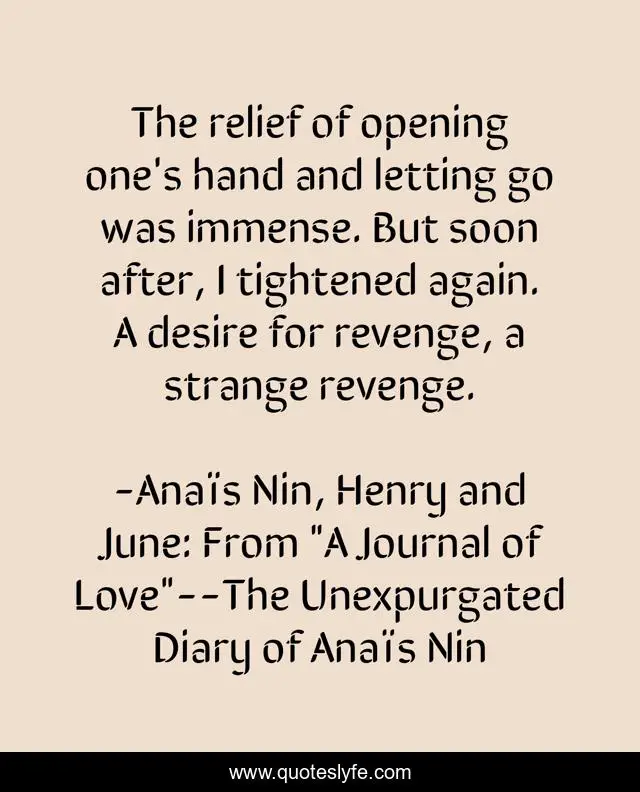This page presents the quote "The relief of opening one's hand and letting go was immense. But soon after, I tightened again. A desire for revenge, a strange revenge.". Author of this quote is Anaïs Nin, Henry and June: From "A Journal of Love"--The Unexpurgated Diary of Anaïs Nin. This quote is about letting-go, love, revenge, affection,.