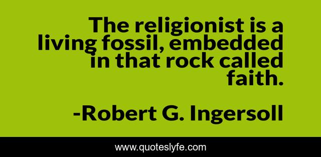This page presents the quote "The religionist is a living fossil, embedded in that rock called faith.". Author of this quote is Robert G. Ingersoll. This quote is about atheism, faith, religion,.