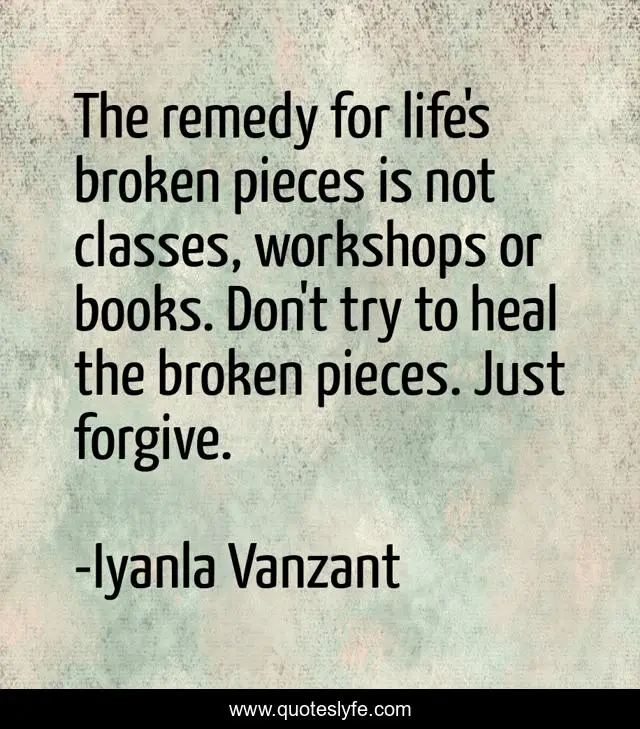 This page presents the quote "The remedy for life's broken pieces is not classes, workshops or books. Don't try to heal the broken pieces. Just forgive.". Author of this quote is Iyanla Vanzant. This quote is about broken, life, forgive,.
