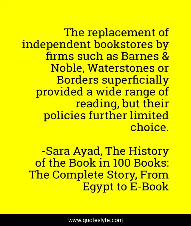 This page presents the quote "The replacement of independent bookstores by firms such as Barnes & Noble, Waterstones or Borders superficially provided a wide range of reading, but their policies further limited choice.". Author of this quote is Sara Ayad, The History of the Book in 100 Books: The Complete Story, From Egypt to E-Book. This quote is about limitations, books, bookstores,.