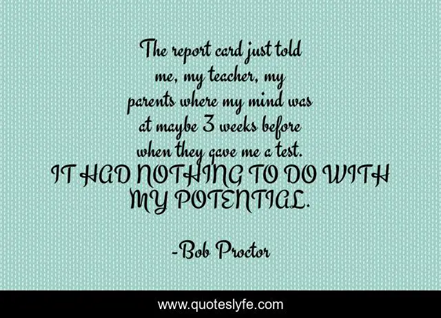 This page presents the quote "The report card just told me, my teacher, my parents where my mind was at maybe 3 weeks before when they gave me a test. IT HAD NOTHING TO DO WITH MY POTENTIAL.". Author of this quote is Bob Proctor. This quote is about personal-development, personal-growth, potential, self-help,.