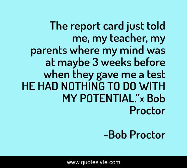 The report card just told me, my teacher, my parents where my mind was at maybe 3 weeks before when they gave me a test HE HAD NOTHING TO DO WITH MY POTENTIAL.”― Bob Proctor