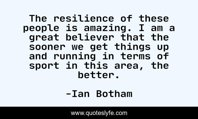This page presents the quote "The resilience of these people is amazing. I am a great believer that the sooner we get things up and running in terms of sport in this area, the better.". Author of this quote is Ian Botham. This quote is about great, resilience,.