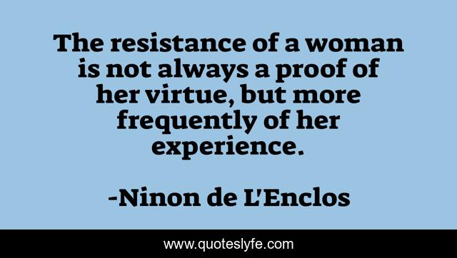 This page presents the quote "The resistance of a woman is not always a proof of her virtue, but more frequently of her experience.". Author of this quote is Ninon de L'Enclos. This quote is about woman, resistance, her,.