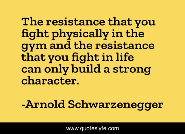 This page presents the quote "The resistance that you fight physically in the gym and the resistance that you fight in life can only build a strong character.". Author of this quote is Arnold Schwarzenegger. This quote is about life, strong, character,.