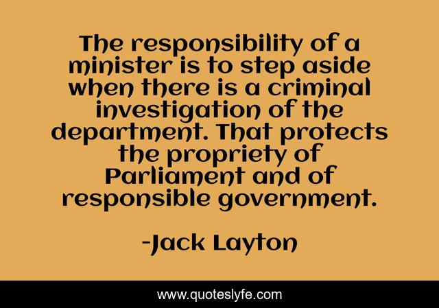 This page presents the quote "The responsibility of a minister is to step aside when there is a criminal investigation of the department. That protects the propriety of Parliament and of responsible government.". Author of this quote is Jack Layton. This quote is about step, responsibility,.