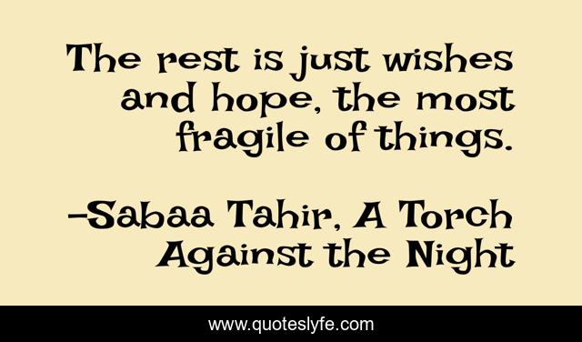 This page presents the quote "The rest is just wishes and hope, the most fragile of things.". Author of this quote is Sabaa Tahir, A Torch Against the Night. This quote is about fragile, wishes, hope, despair,.