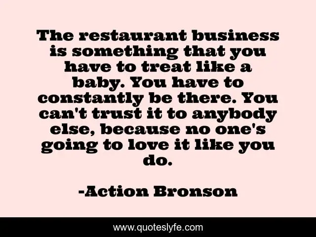This page presents the quote "The restaurant business is something that you have to treat like a baby. You have to constantly be there. You can't trust it to anybody else, because no one's going to love it like you do.". Author of this quote is Action Bronson. This quote is about baby, love, business, affection,.