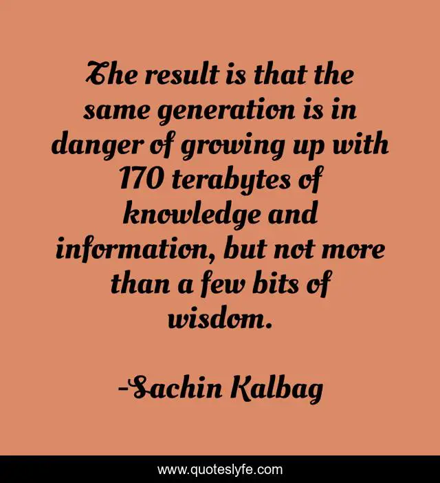 This page presents the quote "The result is that the same generation is in danger of growing up with 170 terabytes of knowledge and information, but not more than a few bits of wisdom.". Author of this quote is Sachin Kalbag. This quote is about information, technology, knowledge, wisdom,.